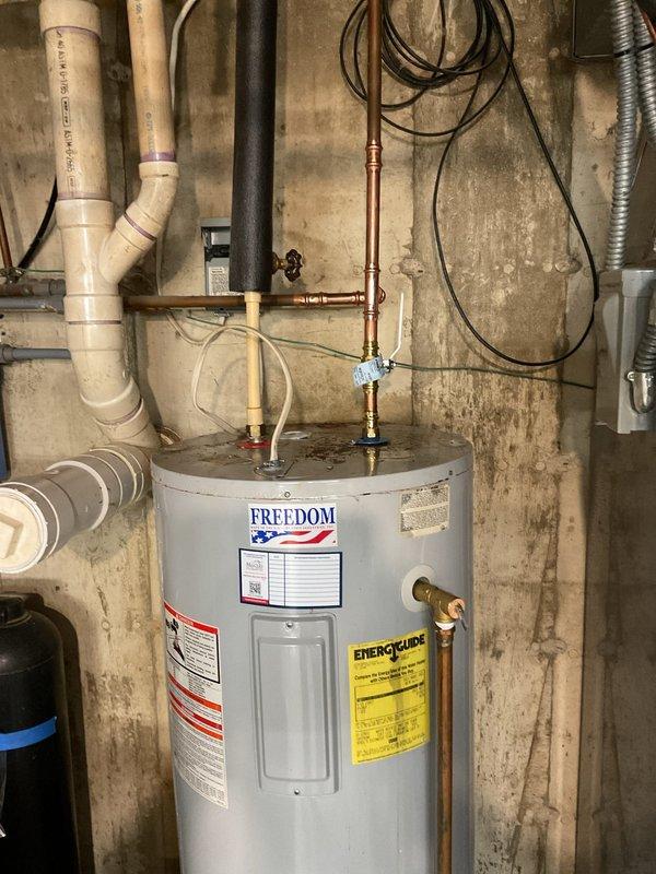 Responded to service call for leaking tanked electric water heater in basement utility area. Upon inspection, identified leak at fitting connection on copper piping at top of Freedom-brand electric water heater unit. Repaired leaking fitting to restore proper seal and eliminate water loss. Provided information regarding electric tankless water heater options as alternative solution for future consideration.