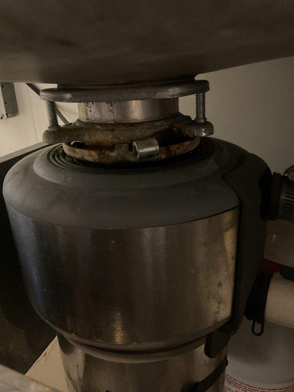 Responded to commercial bathroom water leak at fitting underneath sink. Upon inspection, identified leak source at garbage disposal mounting assembly connection point. Tightened mounting hardware and inspected disposal unit for additional issues, noting corrosion and age-related wear on metal components and mounting ring assembly.